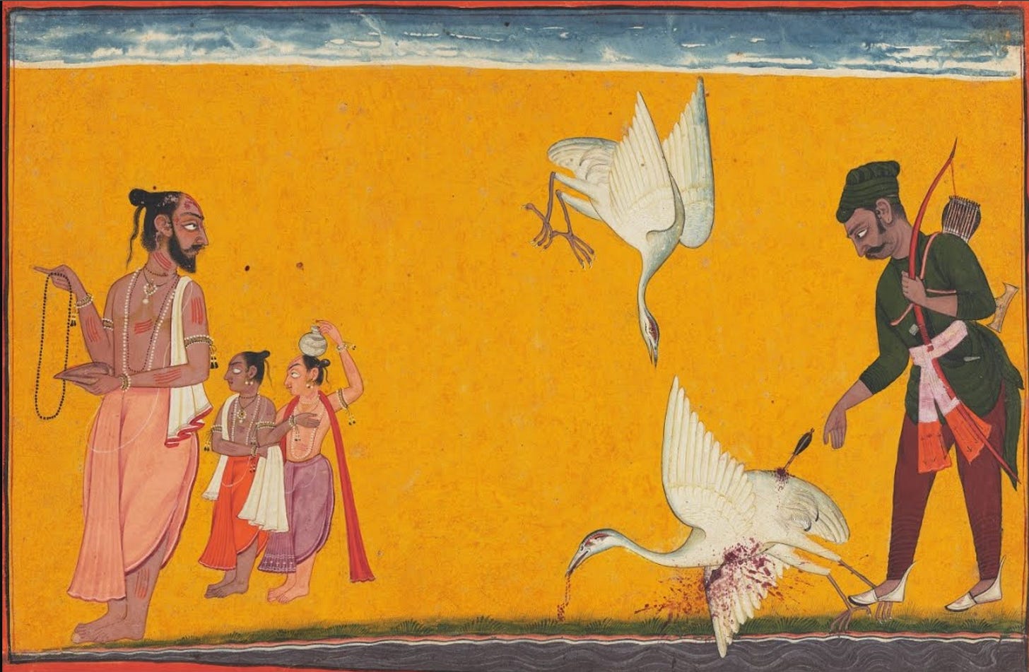 So, one day Valmiki comes across a pair of cranes. He stops and watches them as they coo and preen and do their little bird things. These cranes, Valmiki knows, mate for life and as he stands there he’s witness to a very pure, wholly good, bright spot of love in the world. And as he watches, basking in the glow of this love, an arrow flies in and pierces the heart of one of the cranes. It dies on the spot. Its mate lets out a terrible cry and Valmiki knows it will likely die soon after. With its mate gone, it will lose the will to live, lose the ability to care for itself, totally consumed by grief.